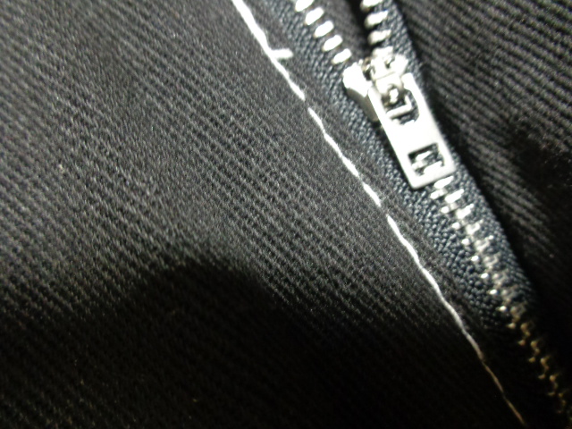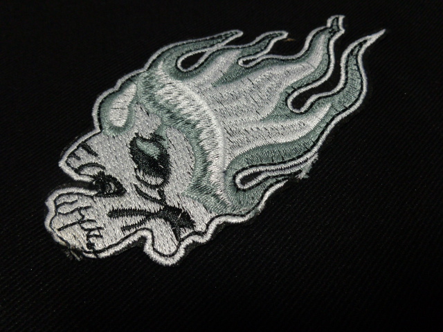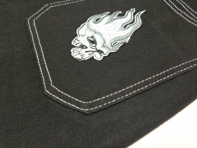 右ヒップポケット部分に刺繍によるスカル柄のパッチ付き。
