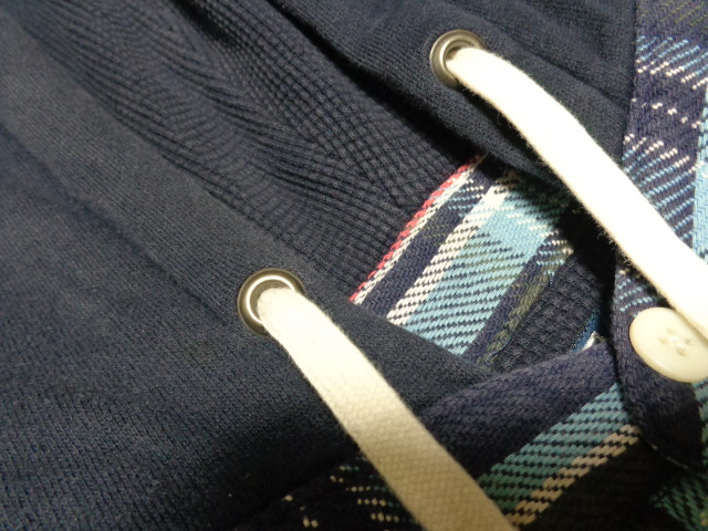 首元にはスウェット素材によるフード & 裏地部分にはワッフル織りのサーマルが施されており