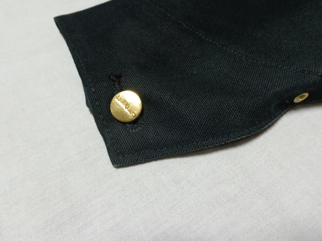 ボタンはロゴ刻印入り打込みタイプ。襟元部分はコーデュロイ素材によるあて布付き。